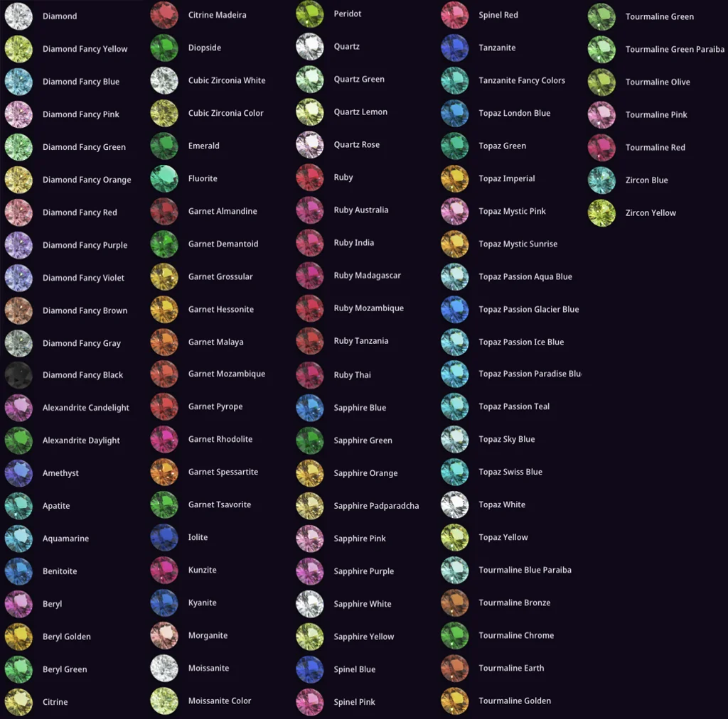 | ~100 gemstones | Diamond, Ruby, Sapphire, Topaz, Tourmaline, ... |
