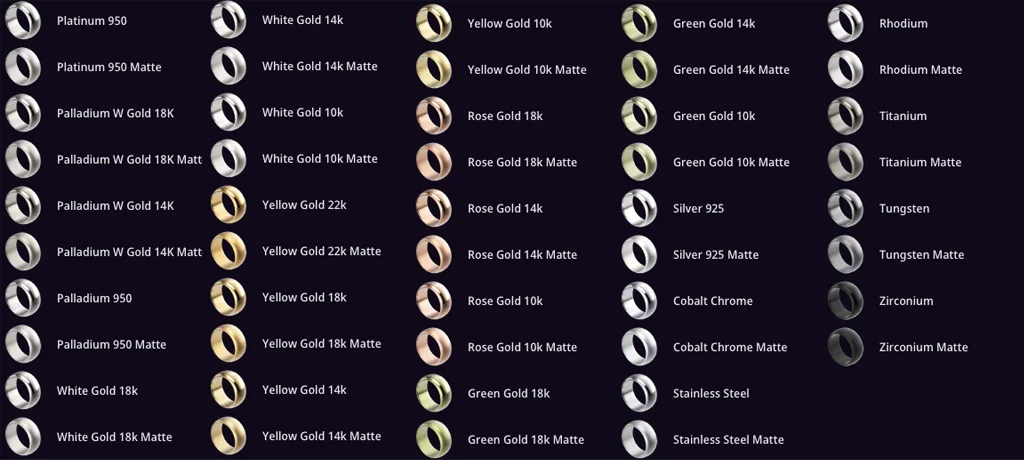 | ~60 metals | Platinum, White Gold, Yellow Gold, Rose Gold, Silver, ... + matte finishes |